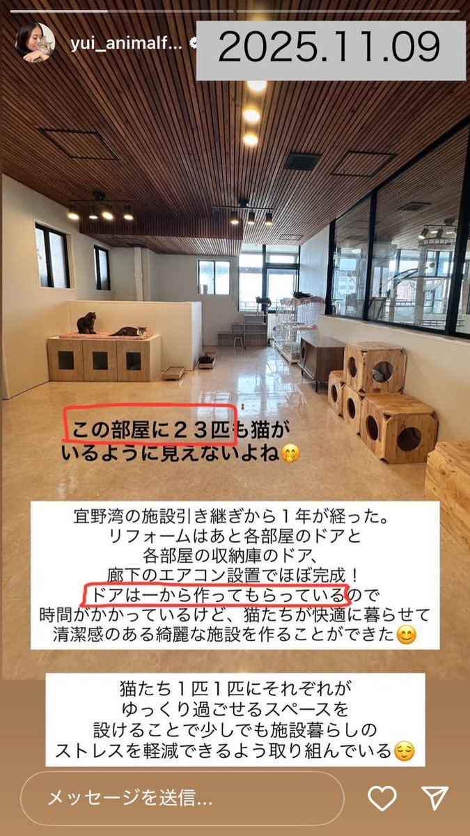 約250匹?の猫付きで入手した宜野湾の施設(崩壊したケルビムのシェルター)は、入手後すぐリフォームに着手。 工事費の総額は1年経っても未だに公表せず、その工事費の出所も不明。 “映え”を意識した不要な内装に加え、ドアは一から作成中だと判明。 一体いくらかけたのですか? #アニマルフォレスト x.com/sa_kagi_sa/sta…